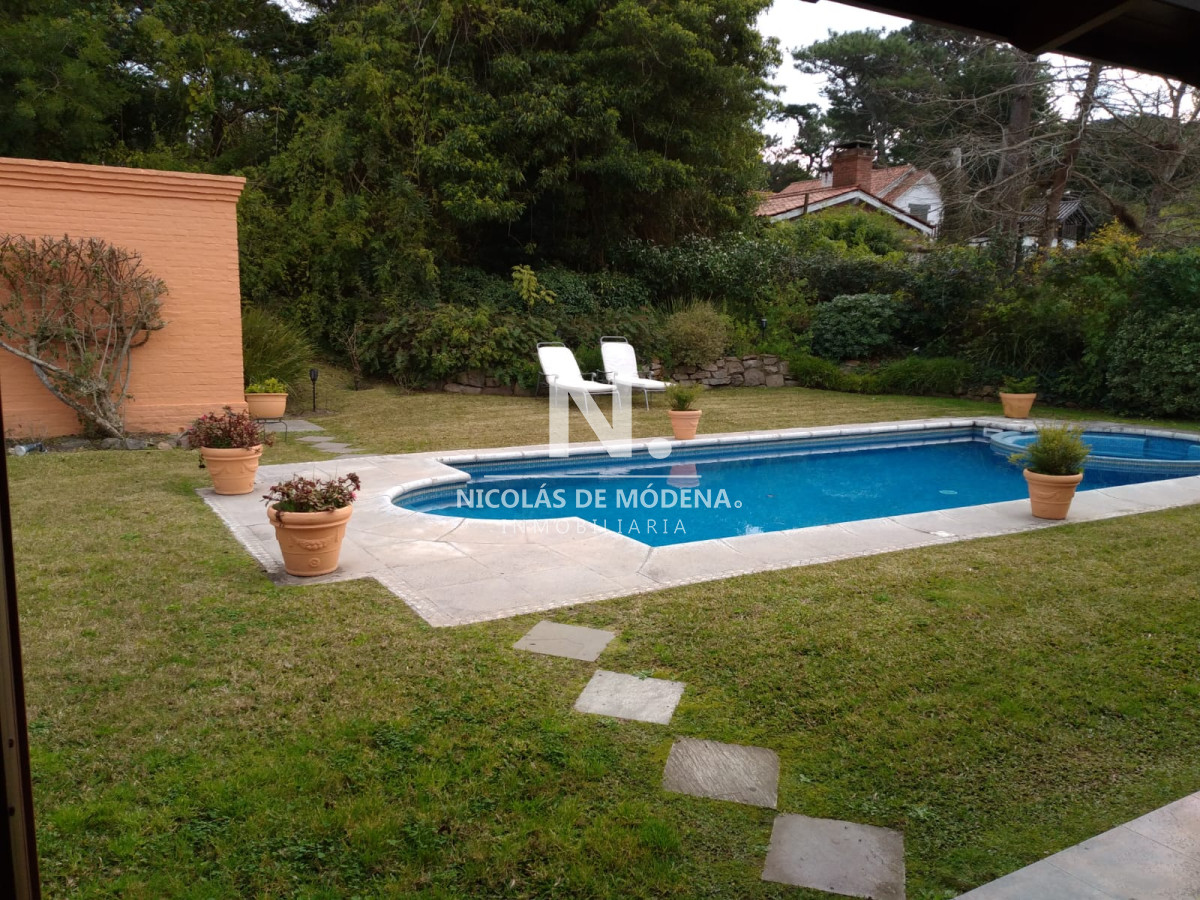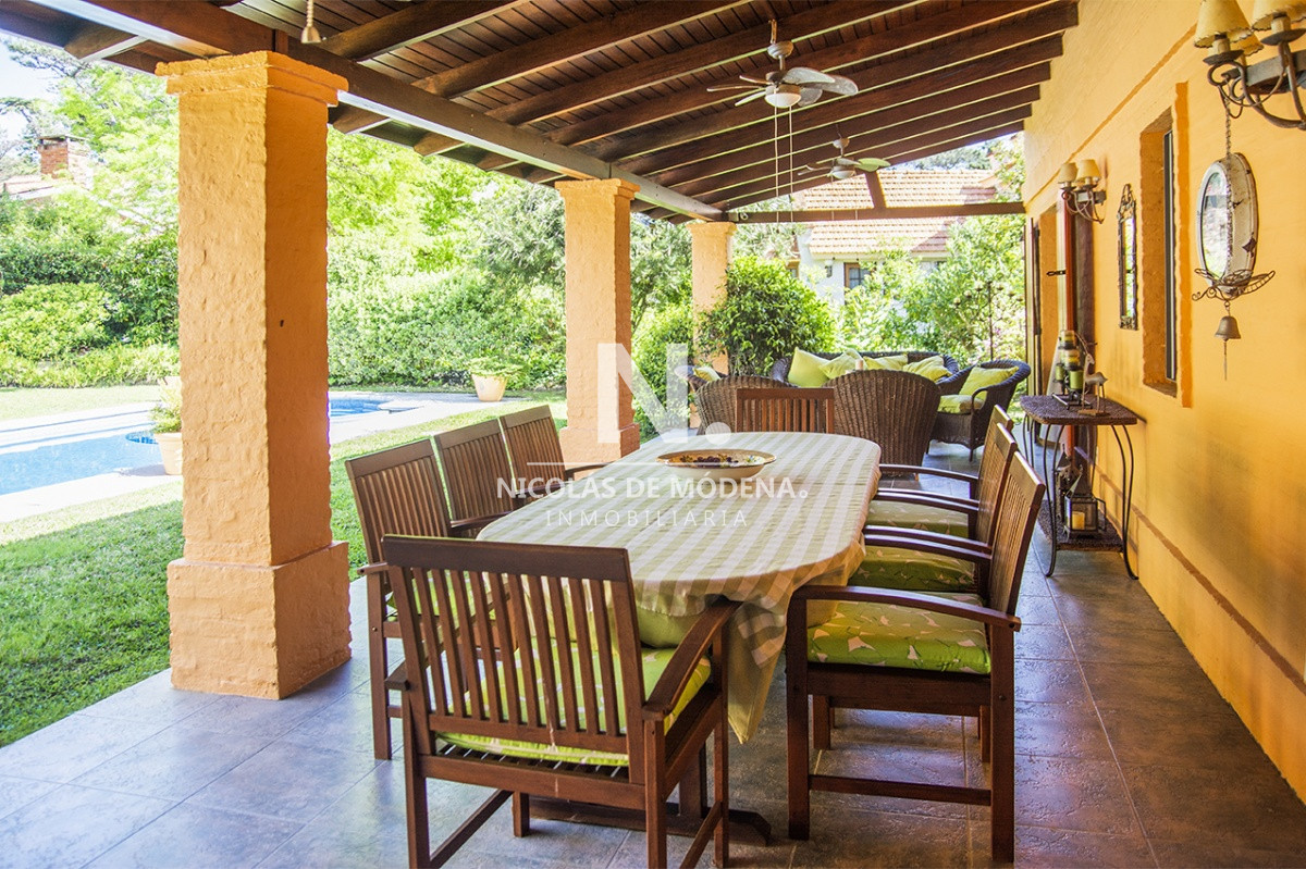 Galería con vista al hermoso jardín con piscina y parrillero.