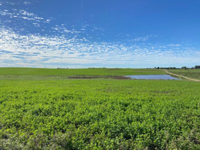 Extenso campo ubicado en la Tercera Sección Judicial de Treinta y Tres, con una superficie total de 1347 hectáreas. Este campo se encuentra a 10 kilómetros por camino de balastro desde la Ruta 18, Km 370, ofreciendo accesibilidad y tranquilidad en un entorno rural. El campo consta de 2 padrones diferenciados. El Padrón A incluye una superficie ocupada por edificaciones de 1.8 hectáreas, destacándose una casa principal con 4 dormitorios y 3 baños, además de áreas de living, comedor y cocina. Además, hay una casa para el capataz, una para el peón, y un galpón destinado a la ganadería, equipado con instalaciones completas para ganado vacuno y equinos, incluyendo tubo de acero inoxidable. También se disponen de 600 metros cuadrados de galpones, taller, lavadero, entre otros. El Padrón B, por su parte, ocupa 0.7 hectáreas y alberga 3 casas dúplex ocupadas por personal, dando cabida a 5 familias en total. El campo está completamente carrozable, dentro de su extensión, se encuentran canales de riego abastecidos por la toma de agua del Río Tacuarí, a nivel de la Laguna Merín, gestionada por Samán. Además, cuenta con caminería interna adecuada para maniobra de camiones, lotes sistematizados de no más de 40 hectáreas, y sistemas de desagote que aseguran un manejo eficiente de las tierras en todas las estaciones del año. Consulte con nuestros asesores.
